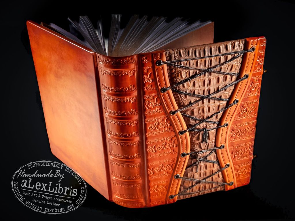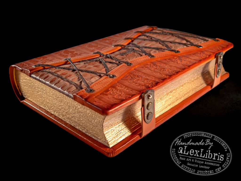 The front cover is a work of art, featuring textured alligator leather surrounded by elegant patina brass chains. Every detail, from the carved and gilded book edges to the specialist bookmaker’s antique finish, exudes luxury and sophistication.