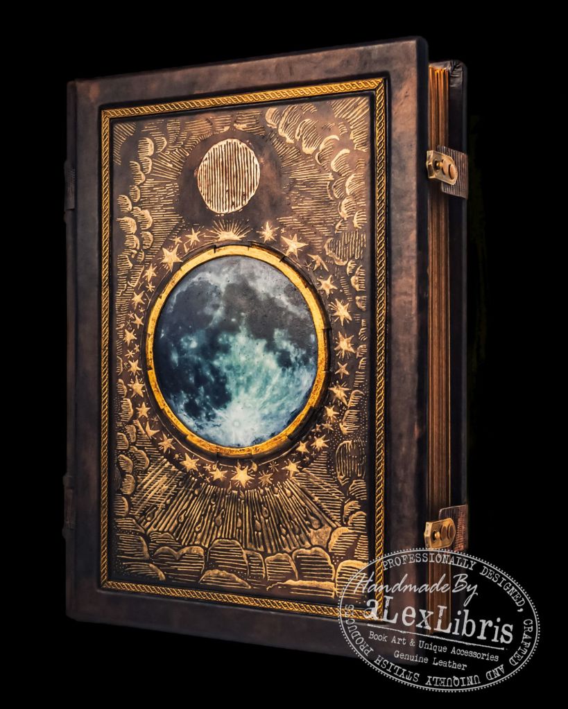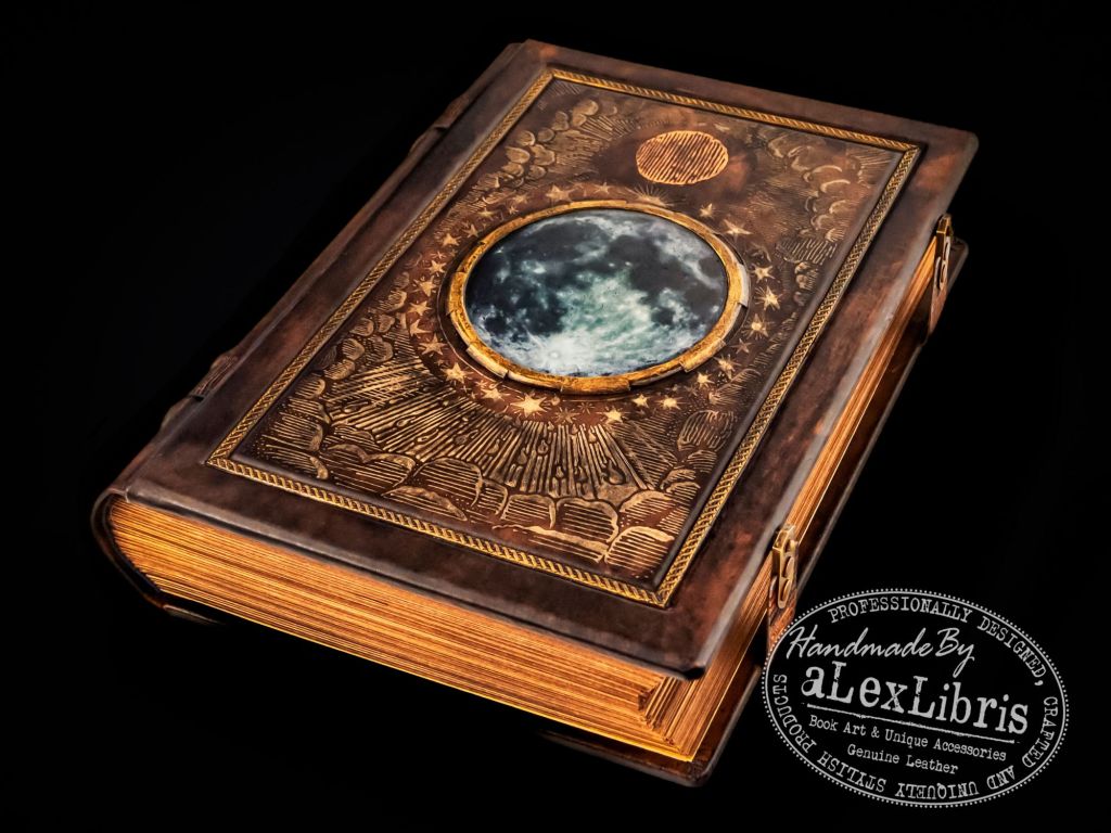 Indulge in the captivating allure of the Full Moon Leather Journal: Embracing Lunar Whispers. The front cover of this journal is adorned with a mesmerizing image of the Moon, nestled beneath aged glass. Bathed in a soft, ethereal glow, it becomes a focal point that beckons you to explore the pages within. Surrounding the lunar visage, gilded motifs of a serene night sky come to life, twinkling stars and wisps of clouds, delicately captured in timeless splendor.