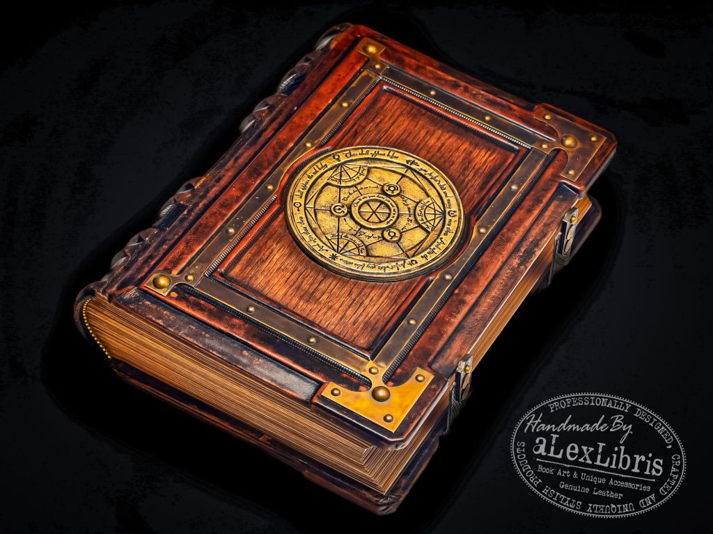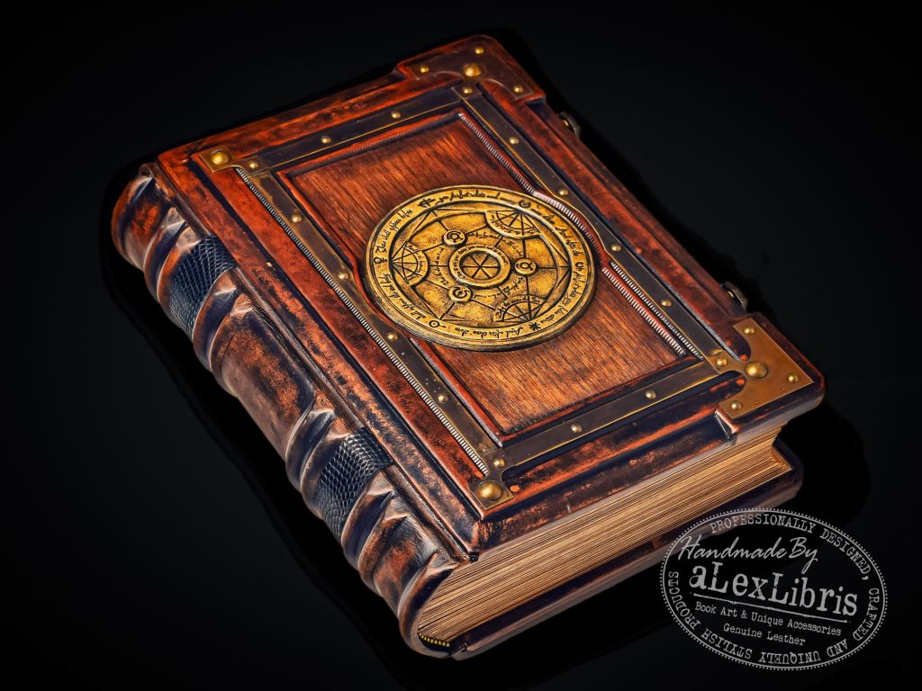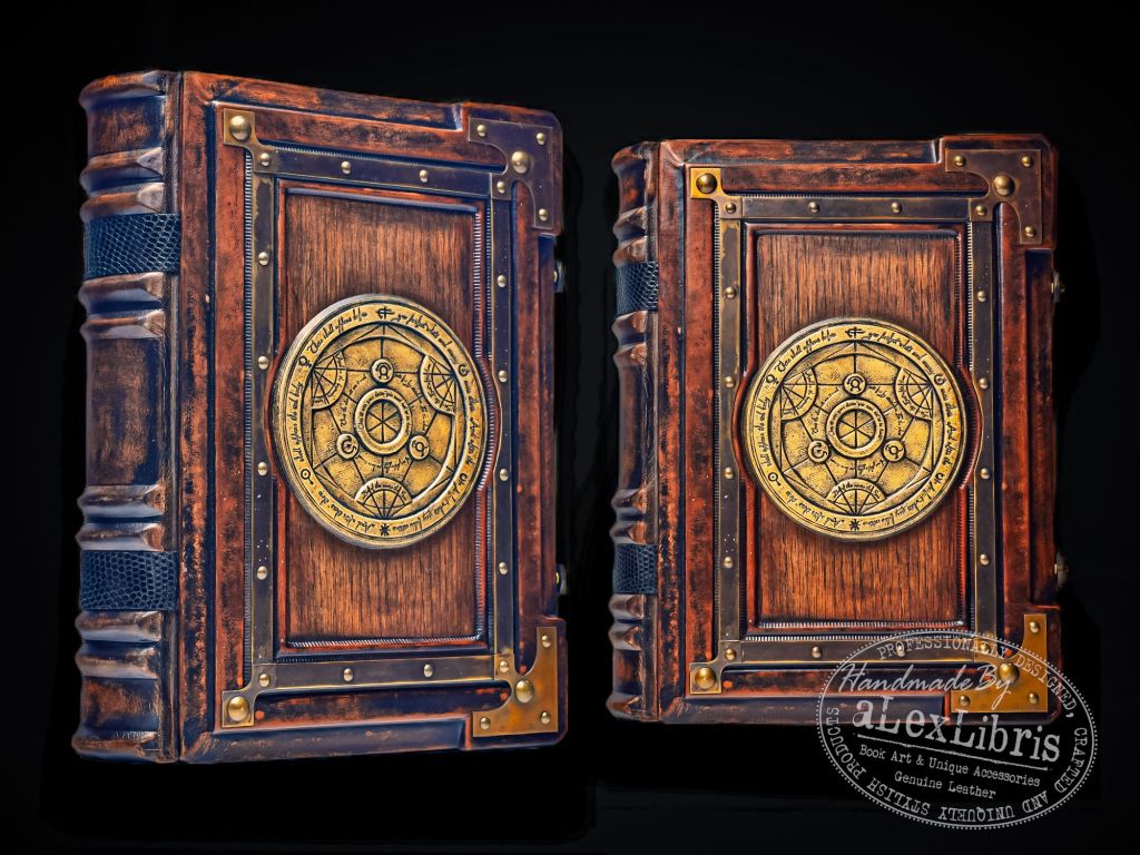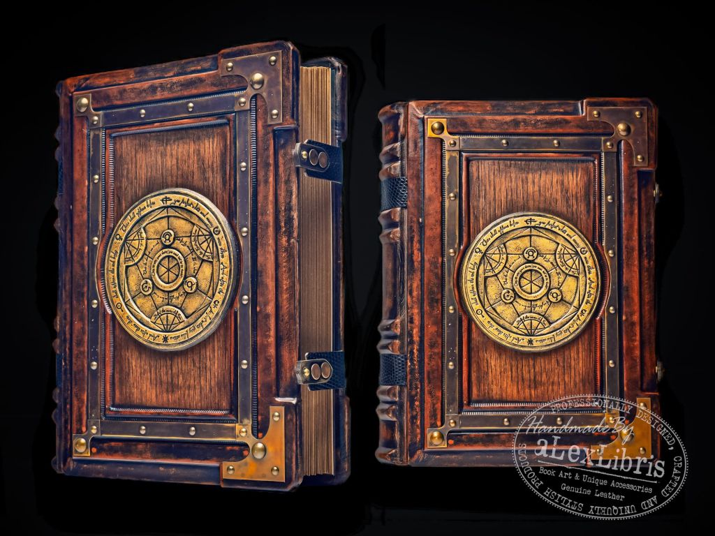 The front cover is adorned with a gilded transmutation circle, a sacred symbol that represents the alchemical processes of purification and transformation. The intricate brass frame enhances the allure of the symbol, captivating the eye and drawing the seeker deeper into the mysteries of alchemy.
