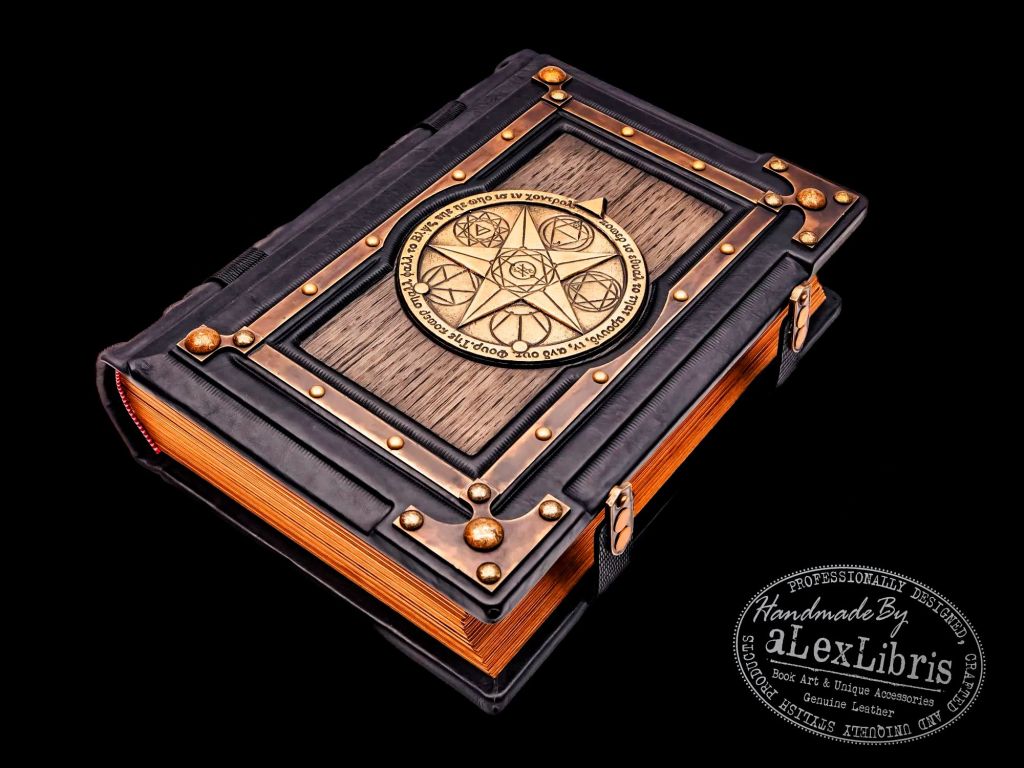 Custom ordered “The Black Grimoire” showcases a unique leather-bound oak wooden plate adorned with a gilded central symbol, surrounded by an brass frame.