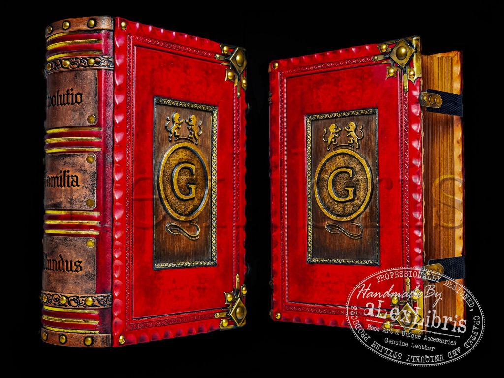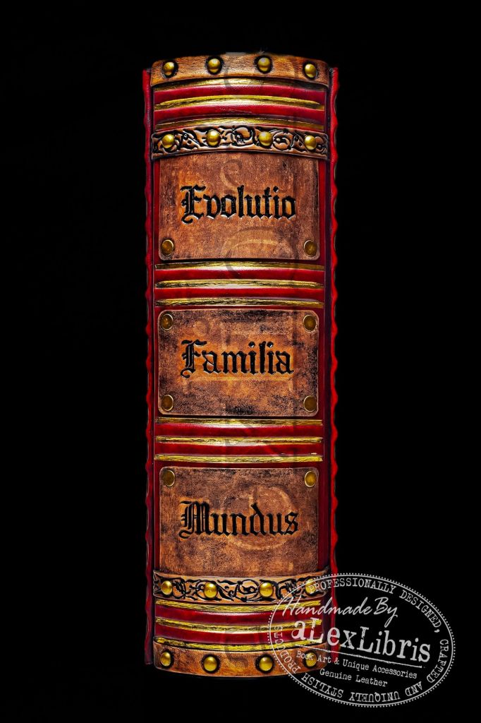 The book spine, meticulously adorned, bears the deep embossed Latin words: Evolutio, Familia, Mundus, representing the concepts of growth, family, and the world. The unique construction of the cover reveals an inner side in a contrasting color, adding an element of intrigue. The gilded and aged paper edges, meticulously crafted with utmost attention to detail, contribute to the journal’s vintage aesthetic and underscore its unique charm.