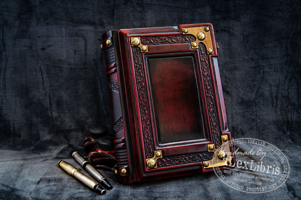 The front cover features a recessed blank central part, adorned with an embossed frame and handmade brass corners. The leather is carefully hand-toned and aged. Additionally, the front cover is symmetrical and easily rotatable, allowing for both left-to-right and right-to-left writing. Available in 8 x 10 and 10 x 13 inches.