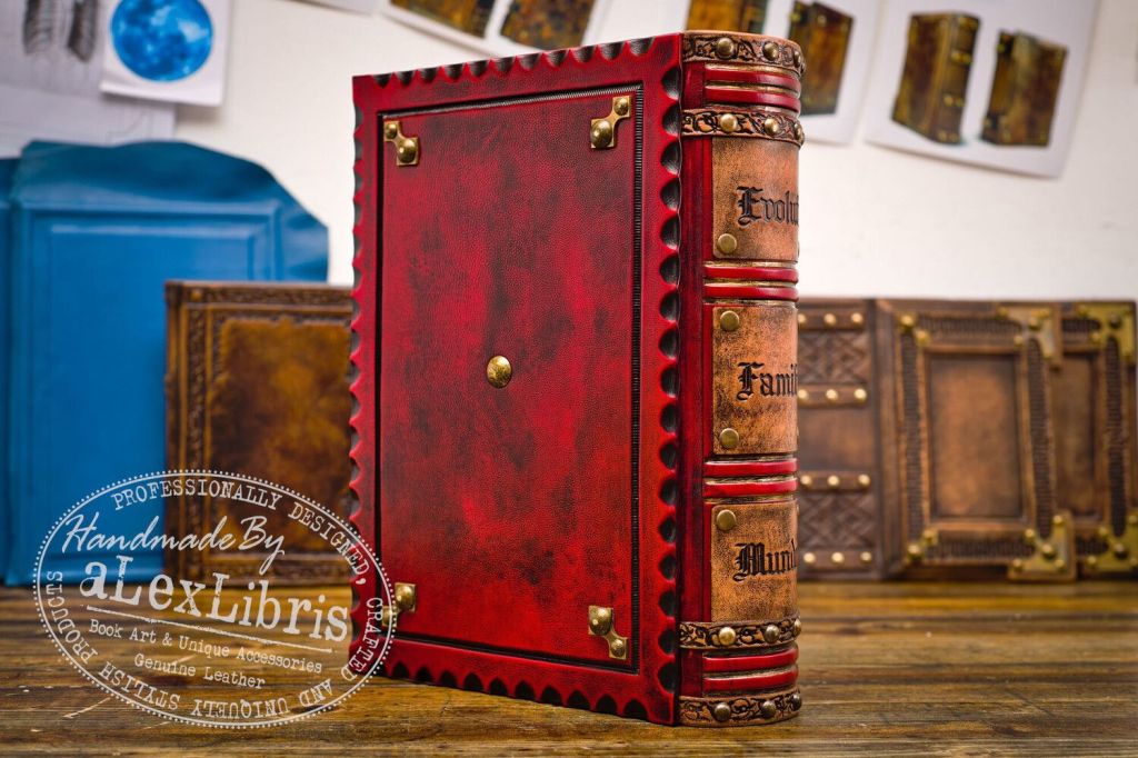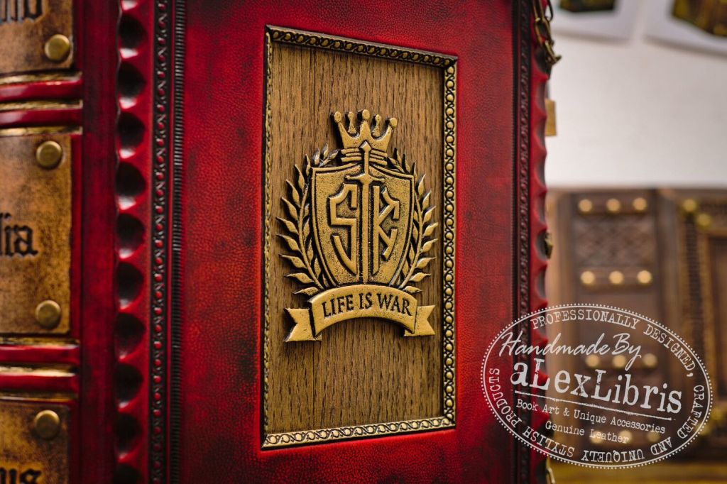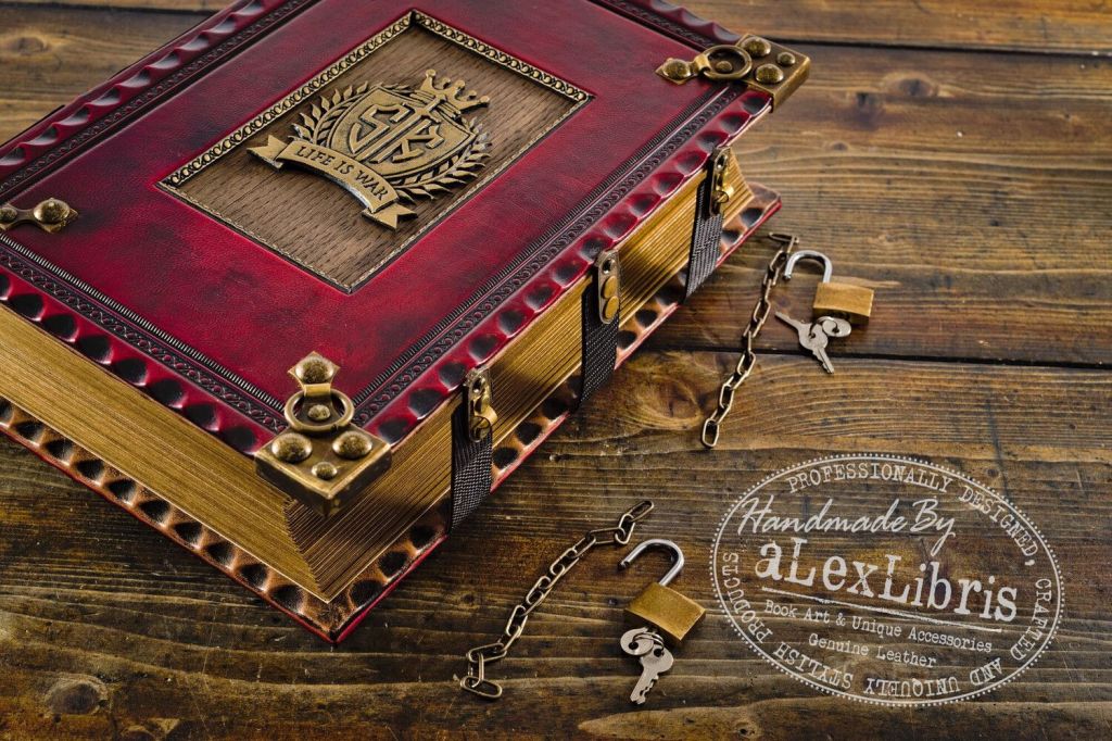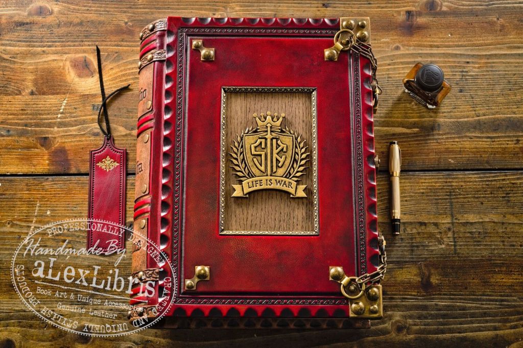 Custom ordered giant leather journal with family crest and strong parchment paper inside.