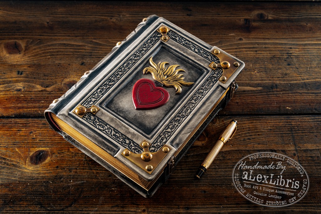 Crafted with reverence and care, this large leather journal features the Sacred Heart symbol – hand-carved and gilded as a powerful emblem of love, sacrifice, and spiritual devotion. Bound in rich black leather and aged by hand for character and depth, this journal is both a personal keepsake and a work of art.