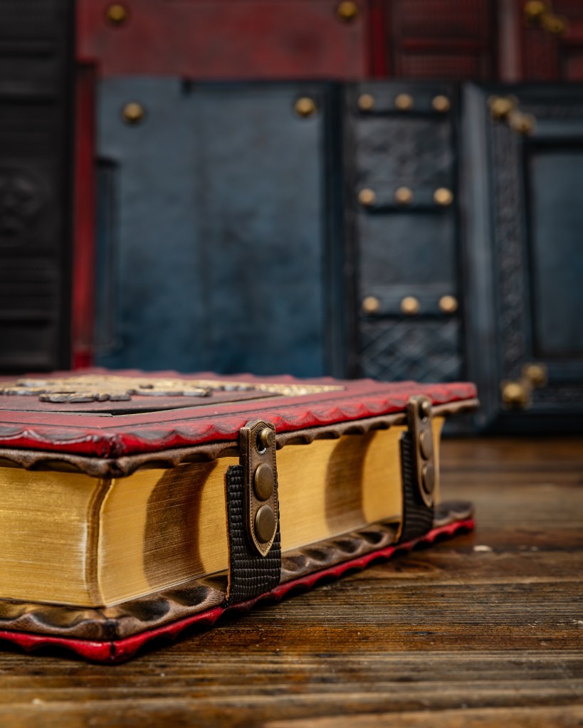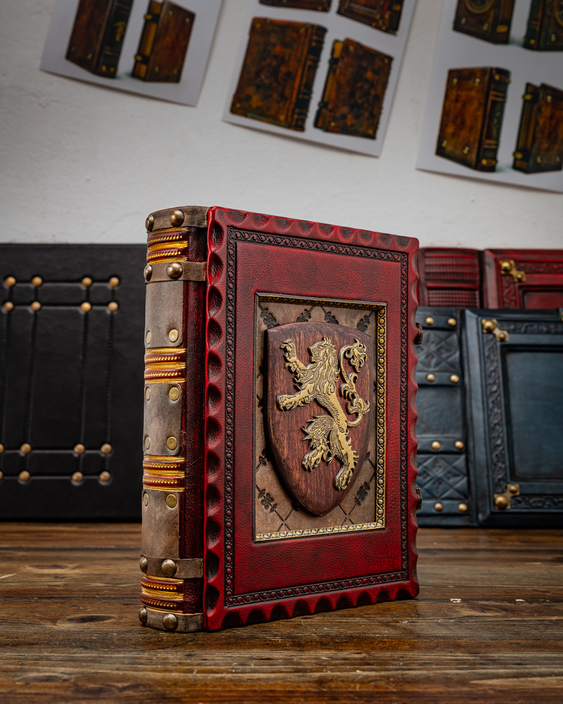 The book cover features hand-carved cover edges, and the inner and outer sides of the cover are in different color tones. The Lion symbol on the shield is chosen by the customer.