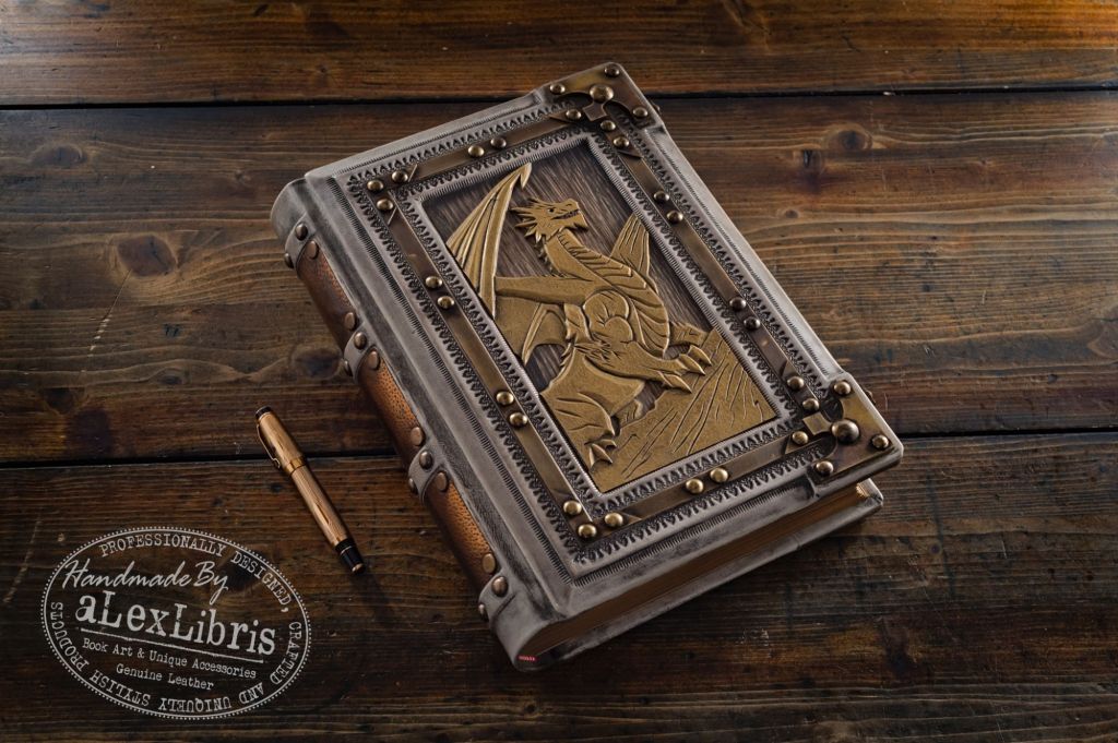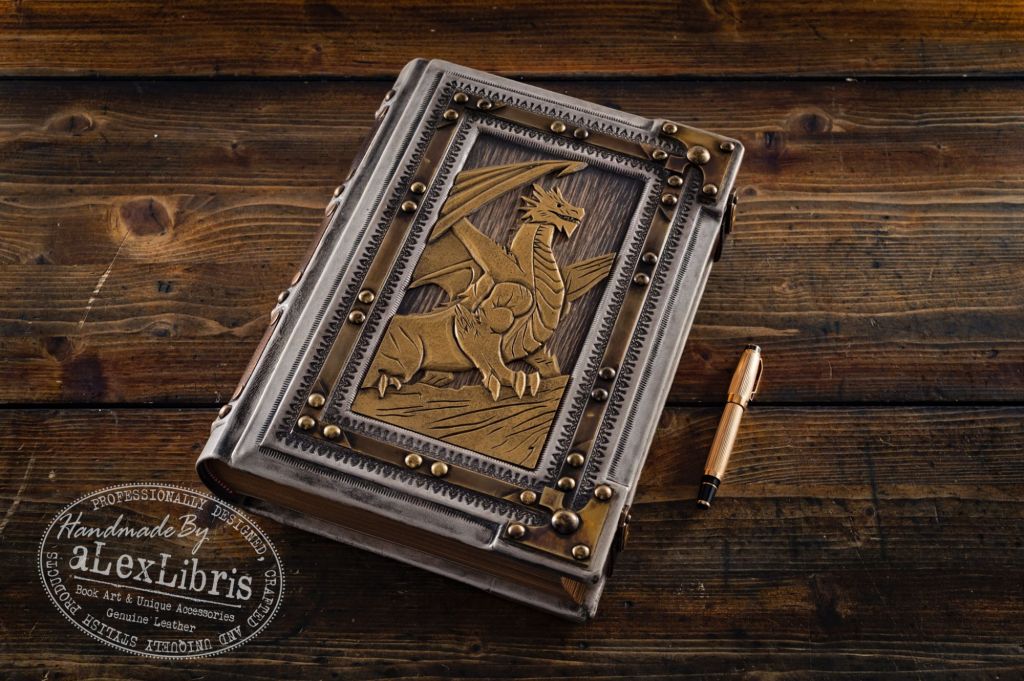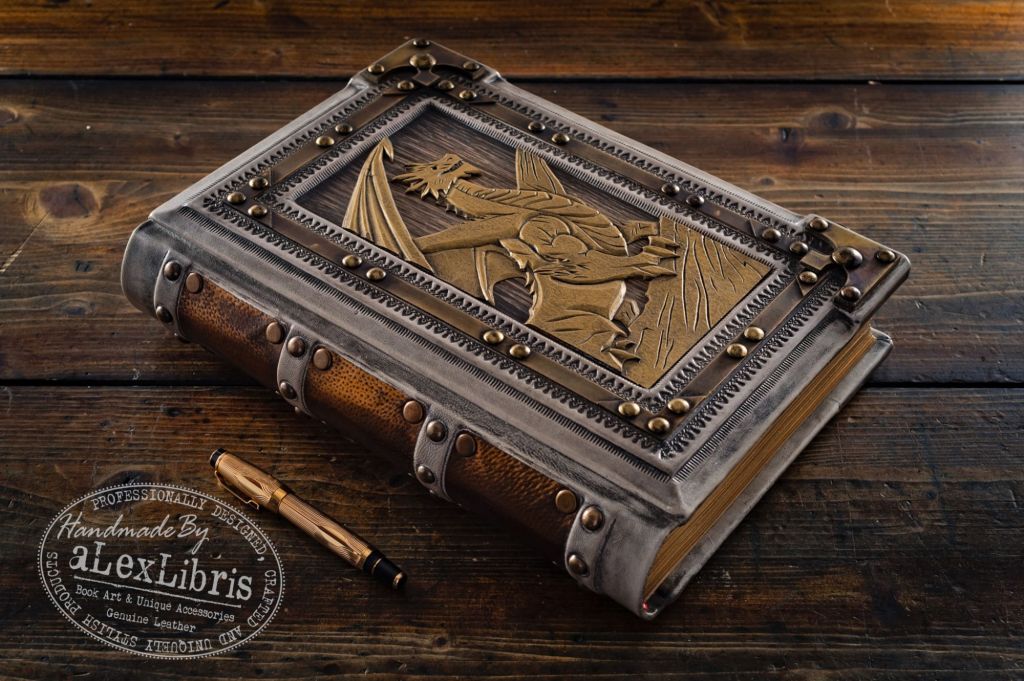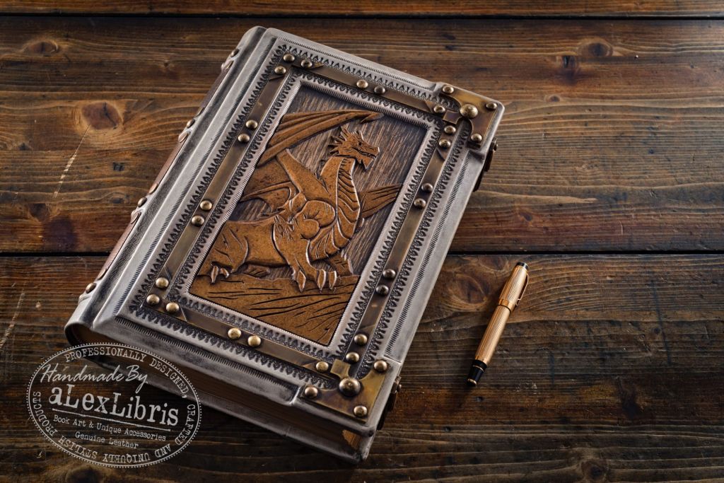 The front cover plate features a recessed central part with a wooden plate surrounded by embossed frames and a brass frame with corners. The white leather is hand-toned and aged. In the center, a handmade dragon carved from thick, specially prepared leather is placed over the wooden plate. In a later process, a hardener is applied with bookbinder’s mixtures and the dragon is gilded and aged.