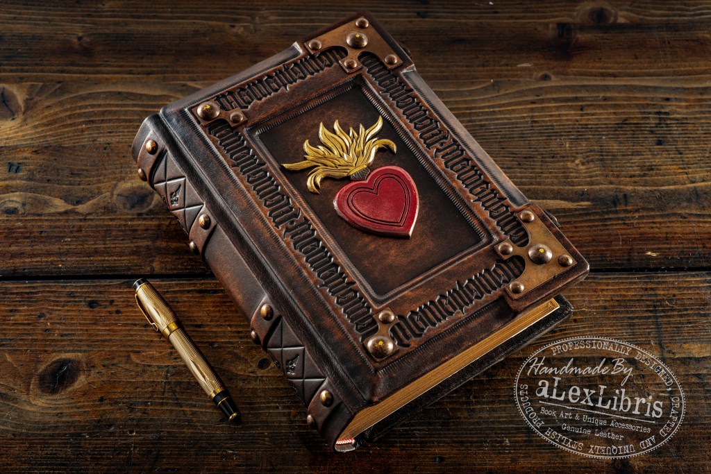 Crafted with reverence and care, this large leather journal features the Sacred Heart symbol – hand-carved and gilded as a powerful emblem of love, sacrifice, and spiritual devotion. Bound in rich black leather and aged by hand for character and depth, this journal is both a personal keepsake and a work of art.