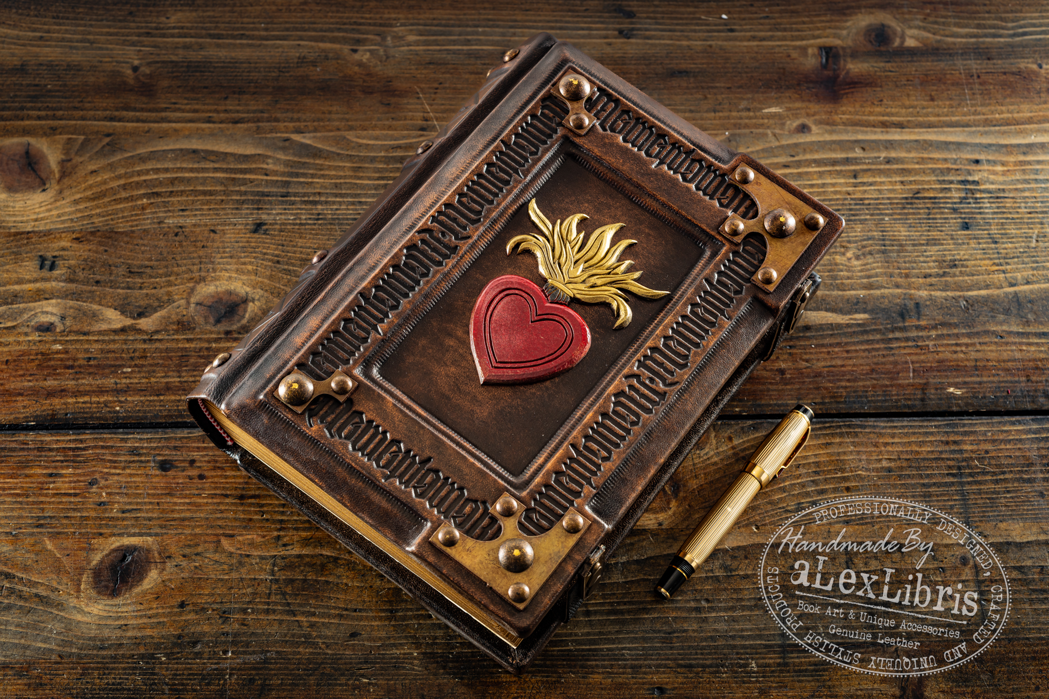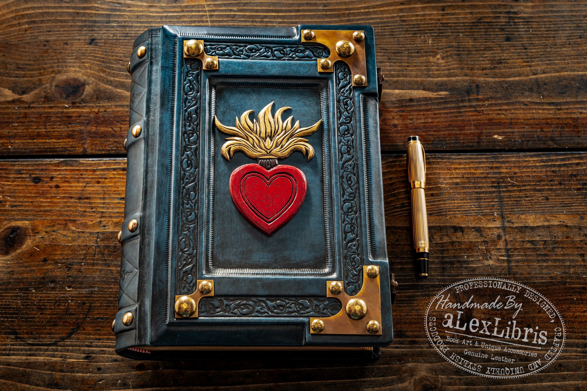 Crafted with reverence and care, this large leather journal features the Sacred Heart symbol – hand-carved and gilded as a powerful emblem of love, sacrifice, and spiritual devotion. Bound in rich black leather and aged by hand for character and depth, this journal is both a personal keepsake and a work of art.