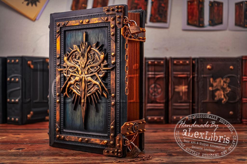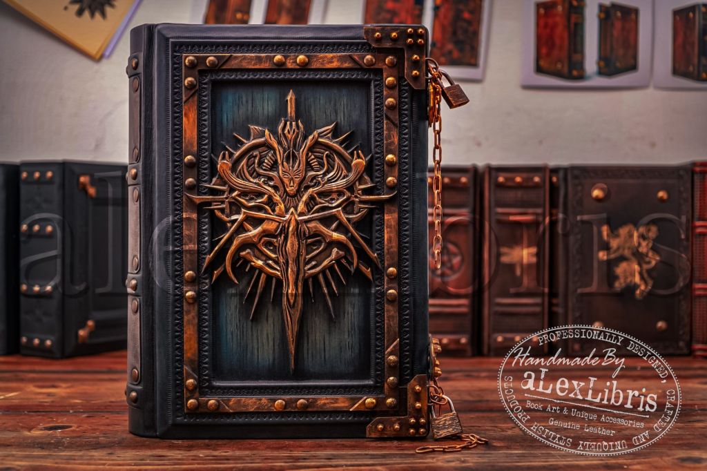 One of the most exceptional pieces crafted in our workshop, this book showcases intricate carving, unique modifications in our work techniques, and a substantial size that posed challenges during its creation. The symbol featured on the front cover is based on a customer’s tattoo, making it a truly personalized masterpiece.