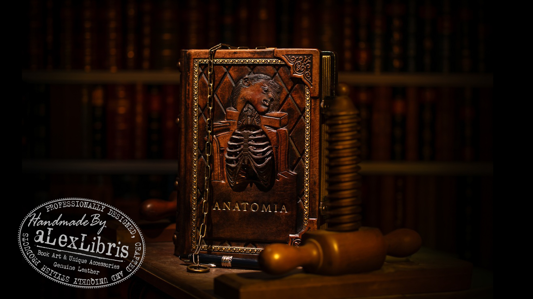 The front cover features an leather rib cage, meticulously hand-carved from thick leather, realistically formed, hand-toned, and coated with special bookbinder’s mixtures. The cover plates boast gradient levels with multiple layered applications, embossing, and carvings, resulting in a uniquely designed book.