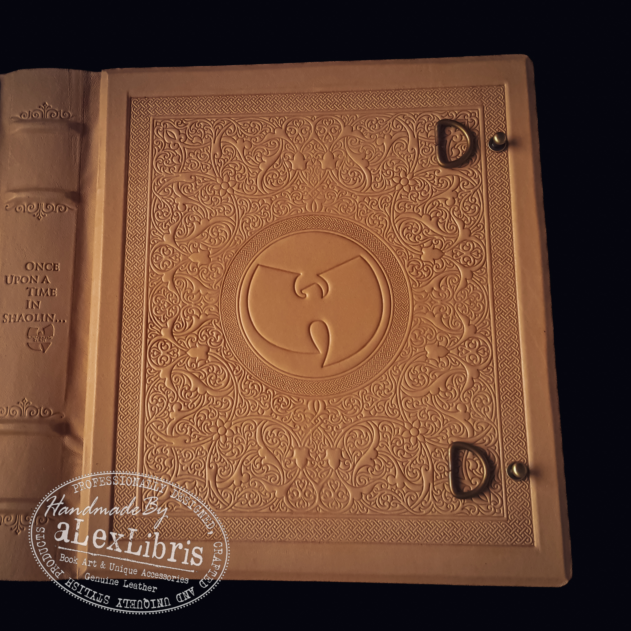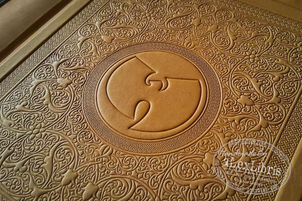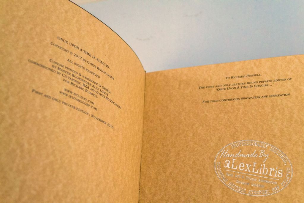 This book was printed in only one copy. It is a leather-bound volume designed to reflect the concept of the single-copy album. The content explores the story behind the sale of Wu-Tang Clan’s Once Upon a Time in Shaolin album.